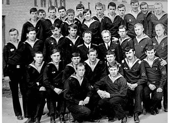 1971 год. Командир части капитан 1 ранга Меркулов И. И. (в центре) и замполит капитан 2 ранга Тропников Н. С. с личным составом