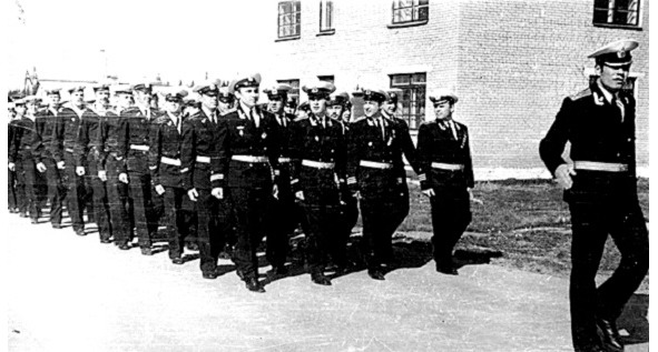 1974 год. Личный состав «Атланта» в парадном строю. В первой шеренге слева-направо: ст. л-т Розов В. А., ст. л-т Скоков И. А., кап. л-т Черняк Р. Х., кап.3 ранга Лют А. Н. Впереди строя ст. л-т Кузнецов В. В.