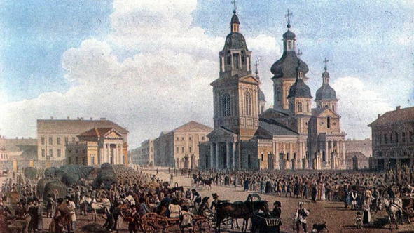 «Дома на Сенной в старину исключительно населялись евреями. Утром, при закупке припасов, они толпами расхаживали на площади. В это время они не приписывались ни к одному из торговых сословий и не были обложены никакими податями. При таком выгодном положении своем в столице евреи богатели в короткое время и стали заниматься ростовщичеством. Когда состоялось положение об евреях, им пришлось приписываться в городские сословия. Большая часть еврейских семейств оставила столицу, следовательно, и Сенную площадь. В счастливые дни пребывания евреев на Сенной на них приходили смотреть столичные жители во время их праздников Кущей. В эти дни сенновские евреи имели обыкновение строить внутри двора временные деревянные шалаши при домах, в которых жили. Снаружи шалаш сходствовал с четырехсторонними башнями и примыкал к дому с нижнего яруса до крыши; одна сторона шалаша сообщалась с внутренними покоями, а три, составленные из стеклянных рам, выходили на двор; шалаш разделялся на столько отделений, сколько дом заключал в себе ярусов, и каждое отделение состояло из одного покоя. Вечером шалаши освещались множеством свечек, евреи с величайшим волнением, шумно располагались на лавках лицом к той стороне стены, которая присоединялась к дому; еврейки обносили мужей разными яствами и вином; евреи, предаваясь торжеству, кричали оглушительно, и под конец веселье переходило в шумную оргию. Тысячи зрителей толпились по дворам, любуясь странными празднествами евреев». (М. И. Пыляев. Старый Петербург)