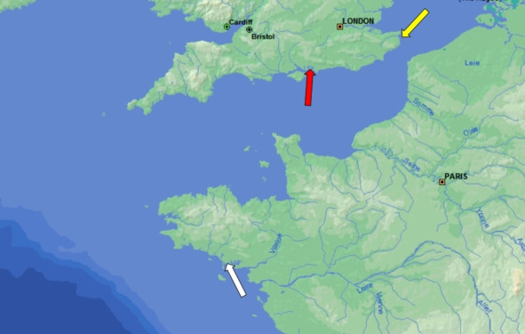 Рейд Даунс (желтая стрелка), Портсмут (красная стрелка), бухта Киберон (белая стрелка)