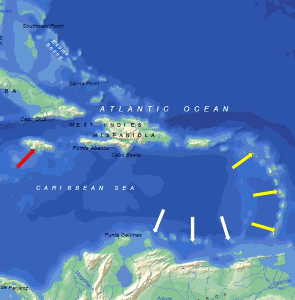 Карибское море: Ямайка (красная стрелка), Подветренные острова (белые стрелки), Наветренные острова (желтые стрелки)