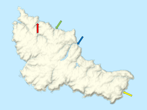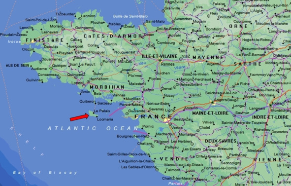 Остров Бель-Иль. Созон (красная стрелка), Порт-Андро (желтая стрелка), форт д'Арсик (синяя стрелка), деревня Сен-Фуа (зеленая стрелка)