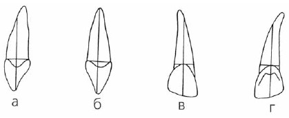 а – правого латерального резца верхней челюсти (медиальная норма); б – правого первого премоляра верхней челюсти (мезиальная норма).