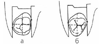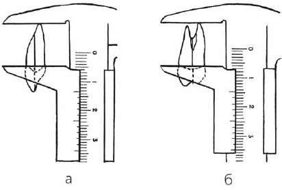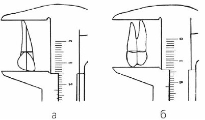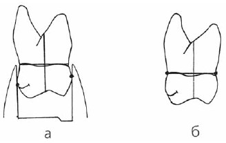 Положение ножек штангенциркуля на аппроксимальных поверхностях коронки четырехбугоркового (а) и трехбугоркового (б) моляров.