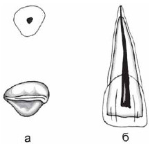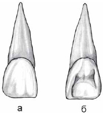 Полость зуба соответствует его внешней форме (рис. 10, б). Полость коронки уплощена в вестибулярно-язычном направлении. В сторону режущего края полость коронки образует углубления, соответствующие углам коронки и бугоркам режущего края.
