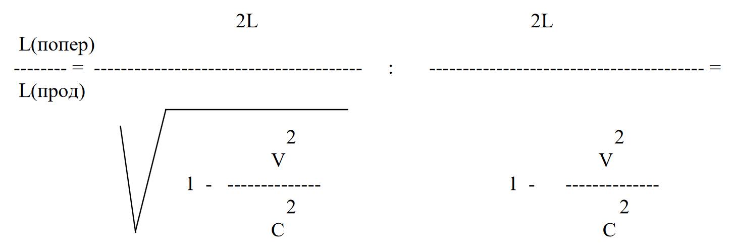 Если Земля не движется, относительно Эфира (так и показал опыт), то V в этой формуле надо считать, равной нулю. Соответственно, и результат формулы равен единице, (то есть длина продольного и поперечного луча равны). Но главное это не формула, а опыт. Формула Майкельсона, – символическая формула. Практический расчёт по ней делать нельзя. Физический смысл формулы, это всего, лишь отношение двух величин (поперечного и продольного лучей). Расчёт предполагаемого сдвига земли, относительно Эфира (луча света), возможно выполнить реальной формулой представленной выше по тексту:
