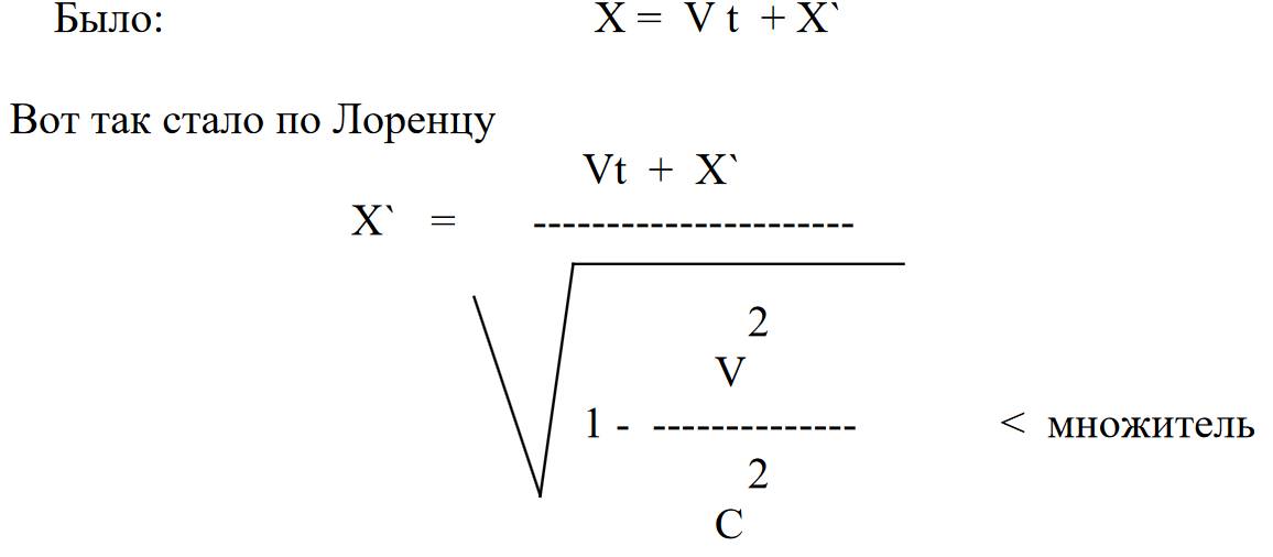 Более того, Лоренц вместо t вывел невероятную формулу времени. Время в его формуле связано с длиной и зависимо от скорости. Это уже не время. Может, как Фарадей он вывел её на основании опытных данных. Нет, он вывел её из своей же формулы длины, которую придумал. Но зачем? Сокращая длину движущегося тела, Лоренц выразил свою Электронную теорию. Но на каком основании он замедлил время? Теперь от скорости движения зависит и время, а позже и Эйнштейн будет вставлять этот множитель в классические формулы. Множитель превратится в инструмент, выражающий зависимость длины, времени, массы и (других) от скорости движения.