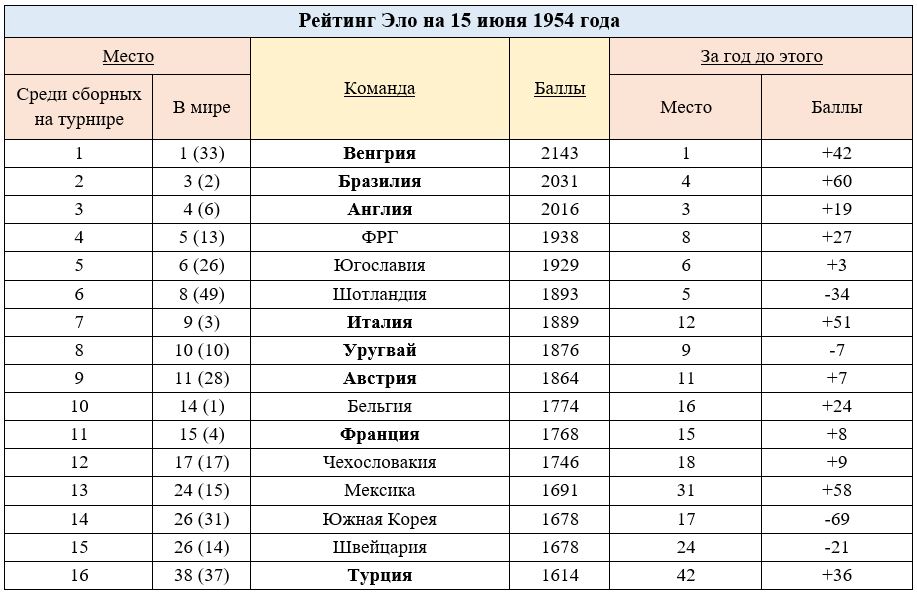 Вот так выглядела таблица рейтинга Эло на 15 июня 1954-го (помимо вышеперечисленных команд, обратите внимание на высокие показатели Шотландии, за год до того и вовсе занимавшей пятую строчку, и относительно низкие действующего чемпиона мира Уругвая). Жирным шрифтом выделены сеянные команды, в скобках указано место сборной в мировом рейтинге Эло на июль 2021 года (Югославия = Сербия):