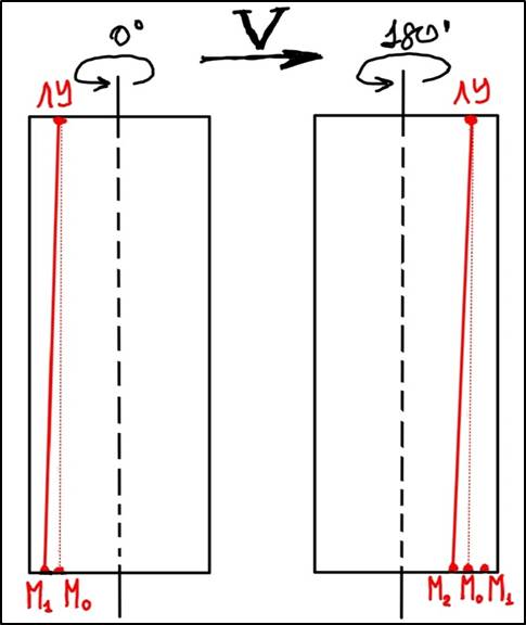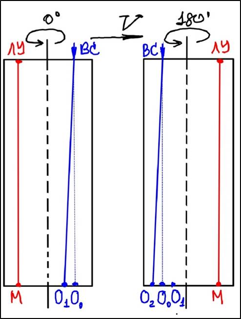 На рисунке № 6 изображено реальная ситуация и смещение внешнего света (схематичное представление годовой звездной аберрации), пока учтем лишь смещение из-за движения Земли по орбите, в направлении восток–запад на те же приблизительно 0,4 мм в сумме при полном обороте канала, или на 0,2 в одну сторону (точность оценки в данном случае значения не имеет, так как важен сам факт смещения).