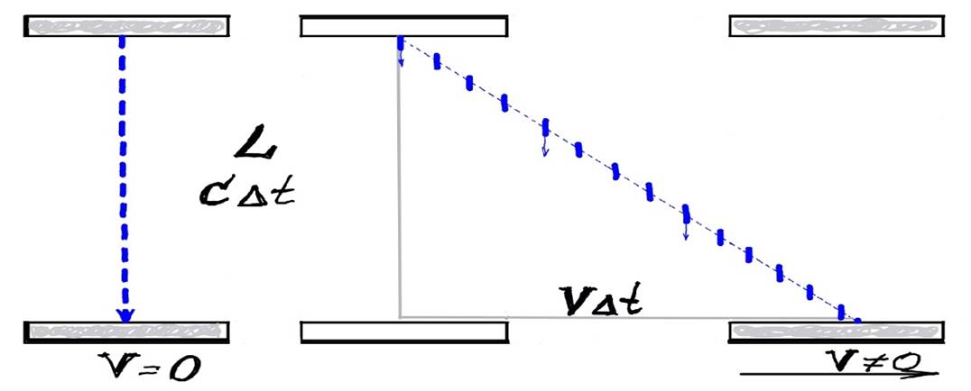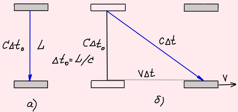 Вот как обычно иллюстрируют эффект замедления времени с помощью световых часов, в которых импульс света периодически отражается от двух зеркал (рисунок № 10, слева часы неподвижны, справа движутся). Расстояние между зеркалами равно L. Время движения импульса от зеркала к зеркалу в системе отсчёта, связанной с часами, равно Δt0=L/C. Пусть относительно неподвижного наблюдателя часы двигаются со скоростью V в направлении, перпендикулярном траектории светового импульса. Для этого наблюдателя время движения импульса от зеркала к зеркалу будет уже больше.