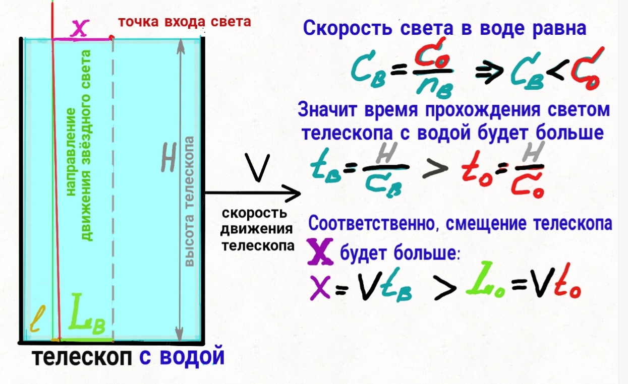И это вообще, как я понимаю, тогда вызвало шок (потом то с помощью СТО все решилось). Как так-то, скорость света в телескопе с водой явно меньше чем без воды. Время прохождения должно быть больше, смещение должно быть больше, аберрация должна быть больше?! Но аберрация не изменилась?! Значит вода в телескопе, движущаяся вместе с ним и Землей не увлекает свет?! И заговорили о необходимости создания новой механики (что потом и получили в виде СТО).