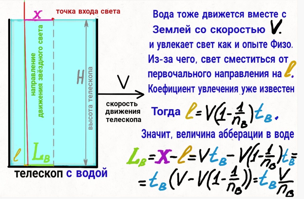 Но ведь все очень просто. И вода в телескопе увлекает свет и свет в телескопе с водой затрачивает больше времени, и Телескоп с Землей и водой смещается на большее расстояние! А вот величина аберрации НЕ БУДЕТ МЕНЯТЬСЯ и НЕ ДОЛЖНА МЕНЯТЬСЯ, какую бы светопроводящую среду в телескоп не заливали!!!