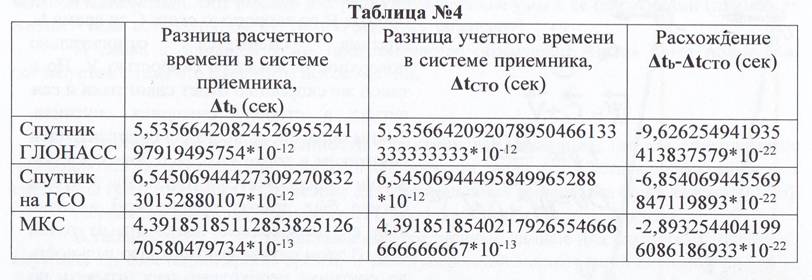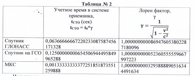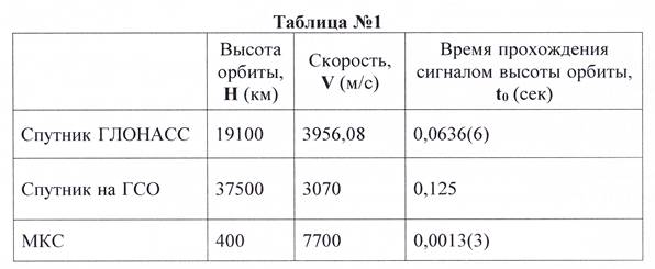 В таблицах № 1 и № 2 представлены усредненные данные для спутника ГЛОНАСС, спутника на геостационарной орбите и международной космической станции, скорость света принята 300000 км/с (для наглядности рассматривается ситуация, когда спутник и приемник находятся на радиусе орбиты, при этом приемник – на поверхности Земли):