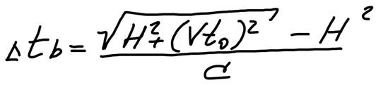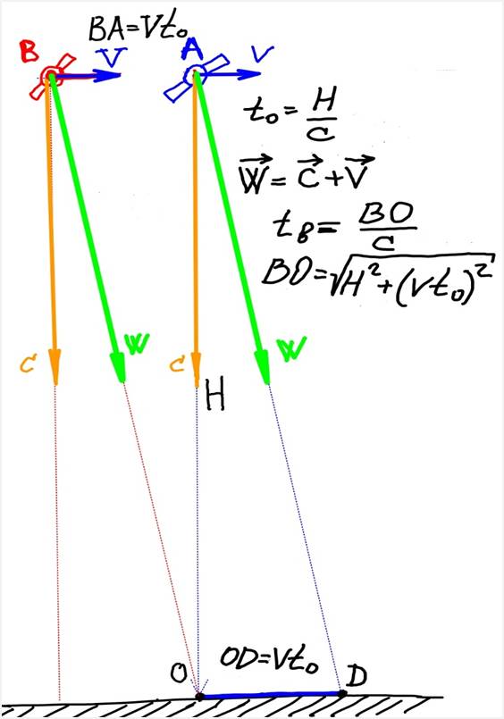 Таким образом, если сигнал будет испущен спутником в точке А, то с поверхностью Земли он пересечется в точке D. А чтобы сигнал был принят приемником в точке О его необходимо отправить из точки В. В этом случае фактическую дальность до спутника необходимо рассчитывать по времени прохождения сигналом пути ВО по его пространственной скорости W равной векторной сумме скоростей спутника V и сигнала C. Но в существующих программах расчета скорость сигнала не может быть больше скорости света. Соответственно, чтобы рассчитать реальную дальность до спутника в момент отсылки сигнала по скорости C, «зашитой» в аппаратуру приемника, необходимо увеличить расчетное время (что и учитывается сейчас релятивисткой поправкой СТО). Расчетное время в этом случае tb = BO/C.