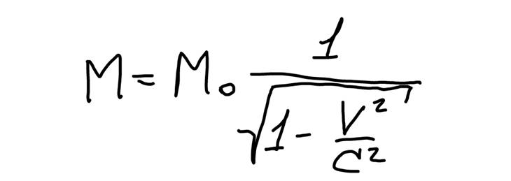 где Mо– масса покоя частицы. При движении энергия понятное дело увеличивается. Так как скорость света постоянна, единственный выход – увеличение энергии происходит из-за увеличении массы движущейся со скоростью V частицы до M. И массу покоя Mо при этом логично связывают с массой М соотношением:
