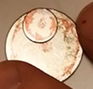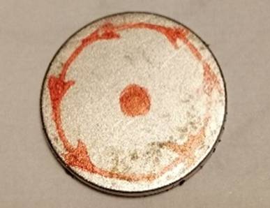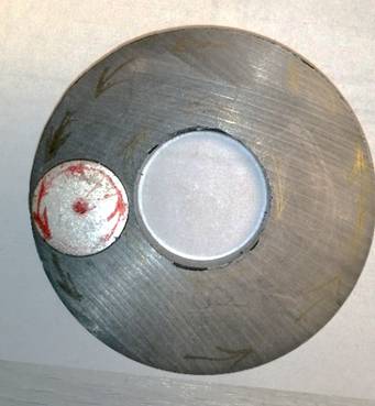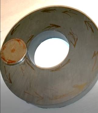 Стало уже совсем интересно, и небольшой дисковый магнит помог все расставить на места. Как выяснилось магнитное поле в магнитах создают не микротоки, магнитные моменты которых взаимно ориентированы. Магнитные силы в магните созданы замкнутыми МАКРОТОКАМИ внутри его структуры. У дискового магнита – это замкнутый круговой ток по внешнему краю (фото № 8), ток для наглядности обозначен красной круговой линией со стрелками (здесь и далее выбор направления абсолютно произвольный, просто для наглядности).