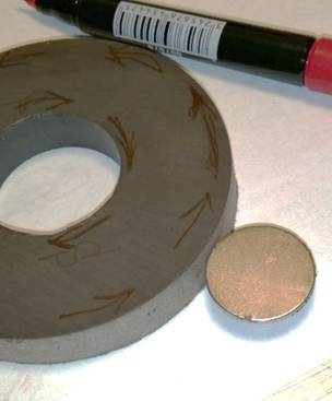 Фото № 8. Дисковый магнит. Стрелки показывают направление тока, создающего магнитное поле. Направление стрелок выбрано случайно, для наглядности.
