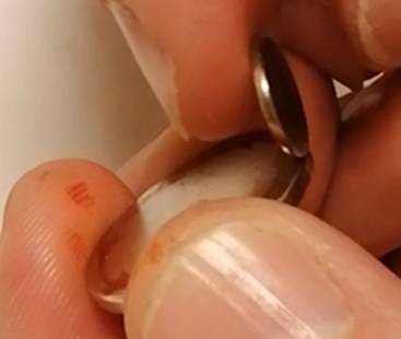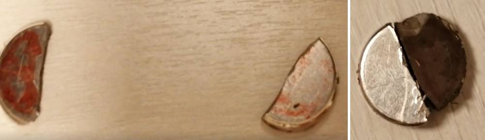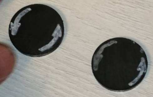 Один из дисковых магнитов сломался пополам и токи в половинках замкнулись по излому, при этом направления сохранились. Если совмещать половинки так, как они были в целом магните, они отталкиваются (фото № 22 слева), но если перевернуть одну «вверх ногами» то они притянуться (фото № 22 права).