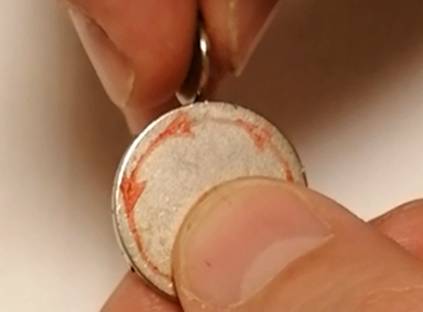 Затем совместил два дисковых магнита, так чтобы они отталкивались, а значит токи в них текли в разных направлениях. Чтобы они не разлетелись друг от друга, зажал их прищепкой. Теперь токи в больших магнитах, «растолкав» друг друга, сместились к противоположным поверхностям дисков. Что на фото явно демонстрируется маленьким магнитом, который притягивается к внешним областям торцов (фото №№ 25, 26).