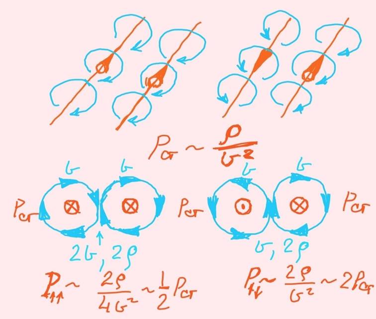 Вокруг двигающихся в одном направлении потоков зарядов, вихри закручиваются так, что во внутреннем пространстве между потоками они направлены в разные стороны, соответственно суммарная скорость протекания струй фотонов между зарядами в два раза больше. Да, в два раза увеличивается и плотность потока, но вспомним, что статическое давление в струе обратно пропорционально квадрату ее скорости. Соответственно, если скорость протекания и плотность возросли в два раза, то статическое давление в пространстве между потоками упадет в два раза по сравнению с давлением снаружи и потоки станут прижиматься друг к другу. Если потоки направлены навстречу друг другу, то между ними фотонные вихри движутся в одном направлении, соответственно скорость струй не меняется. а плотность возрастает в два раза т.е. давление во внутреннем пространстве тоже возрастает в два раза, и потоки отталкиваются. А при сильном приближении двух сонаправленных токов их вихри вообще могут объединиться.