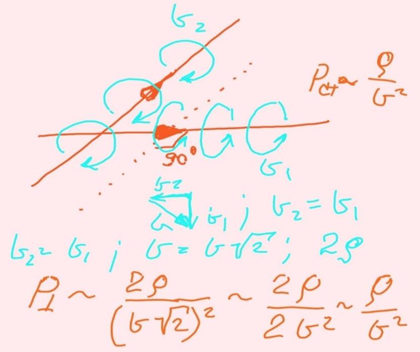Соответственно, если потоки движутся в перпендикулярных направлениях (рисунок № 20) сумма скоростей вихрей дает увеличение их суммарной скорости в √2 раз, а плотность возрастает в два раза. В результате статическое давление во внутреннем пространстве между потоками не меняется, и потоки не притягиваются и не отталкиваются.