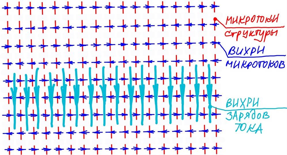 При уменьшении температуры подвижность микротоков в плане переориентации уменьшается, как уменьшается и насыщенность вихрей из-за потери фотонов. При определенной температуре микротоки не только взаимоориентируются, так что вихри становятся перпендикулярными к вихрям движущихся зарядов, но и теряют способность переориентации, сама поверхность вихрей уплотняется и становиться более гладкой. В результате этого, при прохождении ЭТ не оказывается тормозящего действия, то есть сопротивление исчезает и появляется эффект сверхпроводимости (рисунок № 21).