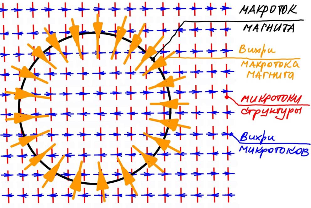Притяжение магнита к стальному предмету также довольно просто объяснить на вихревой основе. Только в этом случае, в дело вступают уже микротоки структуры металла. При приближении магнита микротоки переориентируются, как маленький магнит в поле большого, так что вихри вокруг этих токов ближе к магниту становятся противонаправленными с вихрями вокруг макротока магнита. В этой области создается пониженное давление и микротоки начинают втягиваться в поток макротока. Так как макроток и микротоки не могут выйти из структуры материалов они утягивают за собой последнюю. Таким образом на макроуровне наблюдается притяжение металла и магнита.