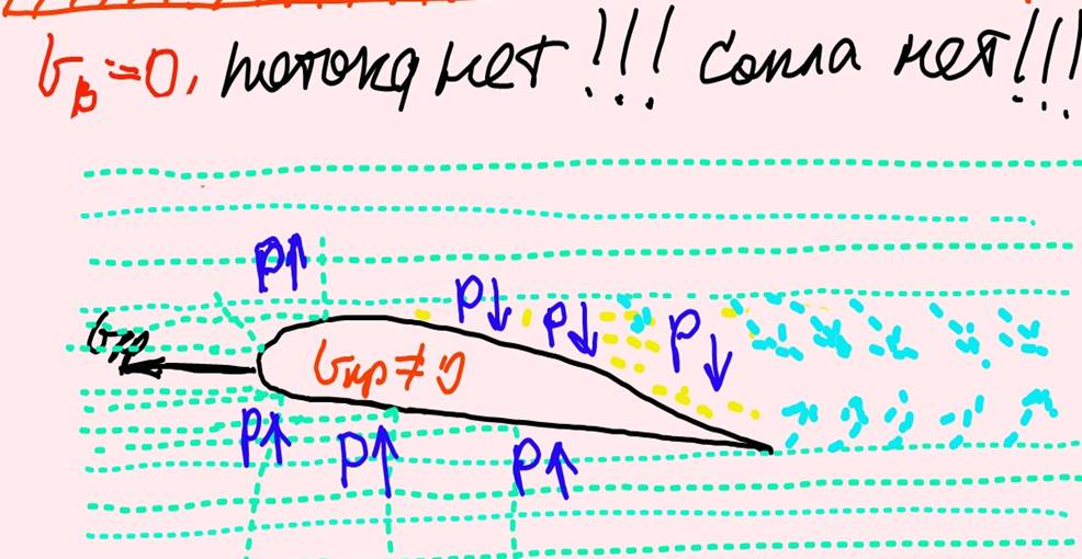 Ко всему прочему, крыло еще и перенаправляет поток вниз. Это подтверждается и тем, что спутная струя от самолета всегда уходит вниз. Да и попробуйте взять что-либо плоское и провести этим предметом в воздухе немного наклонив задний край вниз, предмет будет тянуть вверх, а если наклонить передний край, то тянуть будет уже вниз. Хотя у плоского предмета пути воздуха, что снизу что сверху одинаковы.
