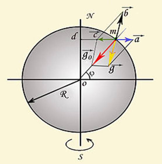 В ИСО тело, находящееся на поверхности Земли, испытывает центростремительное ускорение AC, по величине совпадающее с ускорением точек поверхности Земли, вызванным её суточным вращением. Это ускорение, в соответствии со вторым законом Ньютона, определяется воздействующей на тело центростремительной силой C (зелёный вектор). Последняя складывается из силы гравитационного притяжения к центру Земли G0 (красный вектор) и силы реакции опоры B (чёрный вектор). Таким образом, уравнение второго закона Ньютона для рассматриваемого тела в случае инерциальной системы отсчёта имеет вид MAC=C или, что тоже самое, MAC=G0+B.