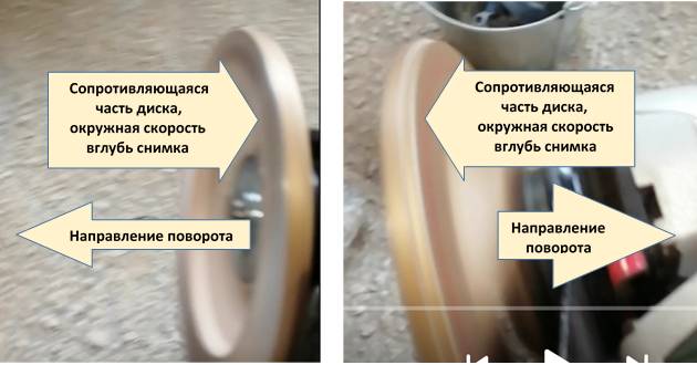 1. При развороте УШМ в плоскости параллельной оси вращения диска, вокруг оси параллельной плоскости диска и находящейся за его пределами, часть диска, вектор окружной скорости которой направлен от оси поворота, довольно ощутимо сопротивляется, противоположная смещается практически без сопротивления в этом случае довольно явно диск делится на две части плоскостью поворота (фото №№ 33 и 34);