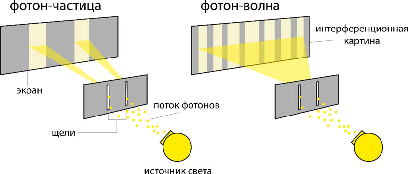 Двухщелевой опыт. Впервые был проведён Томасом Юнгом и впоследствии многократно повторён. Суть его была в следующем. Лазерный луч освещает пластину с двумя параллельными щелями, и свет, проходящий через щели, наблюдают на экране за пластиной. Волновая природа света вызывает явление интерференции, что проявляется на экране как чередующиеся светлые и тёмные полосы. Подобного бы не могло произойти, если предположить, что свет – это поток частиц. Ибо частицы летят только по прямой. И если бы свет был потоком частиц, то фотоны, пройдя через две щели, на экране сформировали бы две яркие точки (а не волновую картину). Тут всё понятно. Свет – это волна. Хотя всегда обнаруживается, что свет попадает на экран в виде отдельных точек (фотонов), а волновая картина (с чередующимися полосами) появляется из-за изменяющейся плотности попадания этих частиц на экран. Предположили, что в процессе полёта свет является волной, но, как только контактирует с экраном, становится частицей – фотоном. В таком случае один фотон должен проходить через обе щели одновременно (как волна) и лишь потом вновь «собираться» в одну частицу, попадающую на экран и формирующую волновой интерференционный рисунок. Совсем уж невероятно.