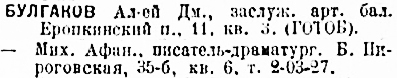 Три цифры в память о несчастной любви, да ещё это «бис» в номере дома на Большой Садовой (дом № 302-бис), не вполне эквивалентная замена семёрке. Сочетание тех же самых цифр мы находим и в телефонном номере Булгакова в то время, когда он жил на Пироговке – 2-03-27. Булгаков на волне своей популярности после постановки «Турбиных» в МХАТ добился, чтобы ему дали телефон именно с таким номером, во всяком случае, содержащим требуемые цифры: