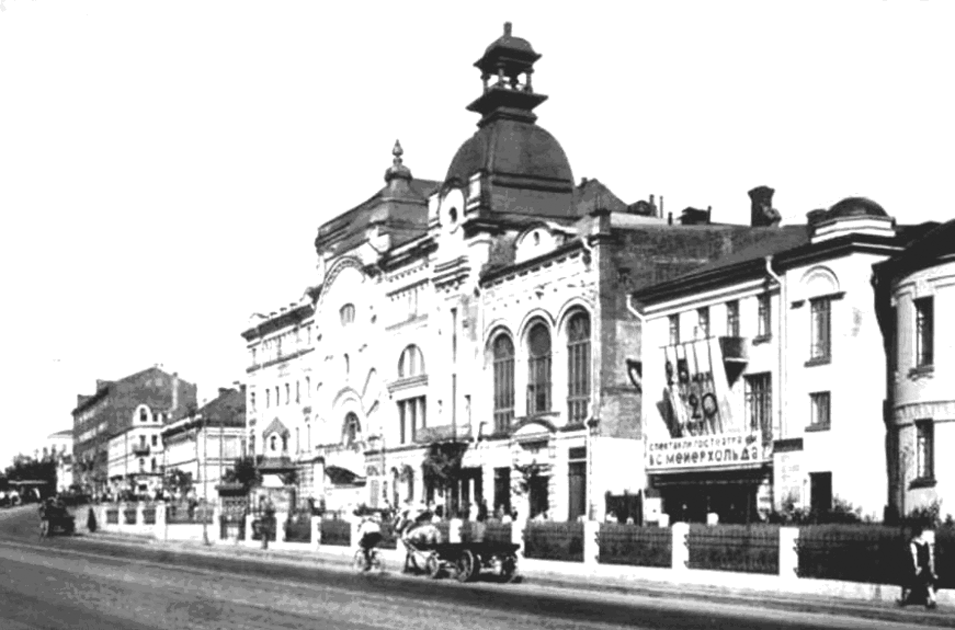 1920-е годы. Вид на Триумфальную площадь со стороны Большой Садовой улицы. Театр Мейерхольда в здании бывшего театра «Буфф» и справа от него – Мюзик-холл в здании бывшего цирка Никитиных.
