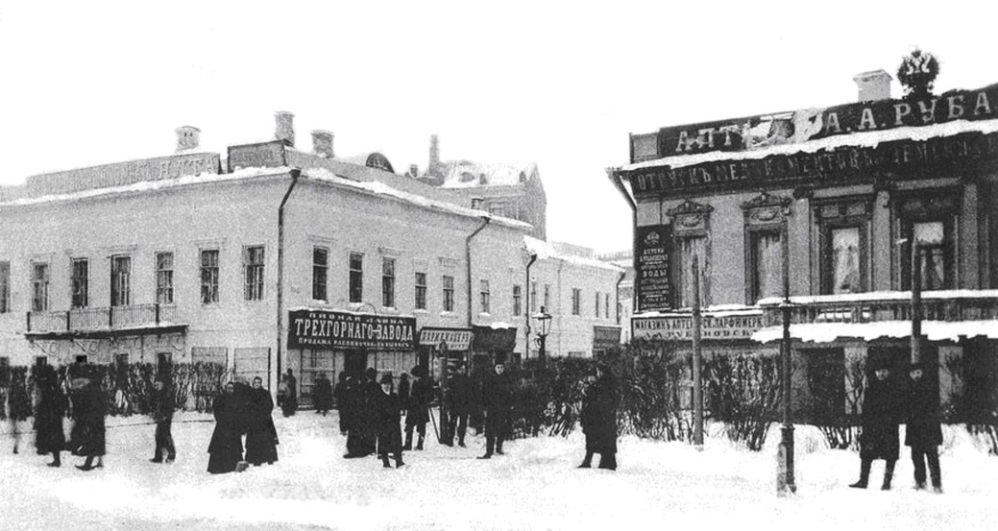 В доме № 23/16 (дом с вывесками) на углу Пречистенки и Еропкинского переулка жил Сергей Вавилов. Слева за деревьями – дом № 30/4 на углу Пречистенки и Малого Левшинского переулка, где в 1926 году жил Булгаков.