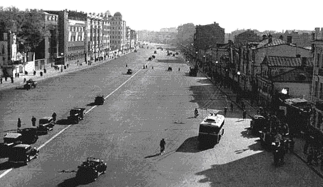 1938 г. Большая Садовая после реконструкции. Слева – сад «Аквариум». Через два дома за ним – дом Пигита, где Булгаков жил в 1922-1924 годах.