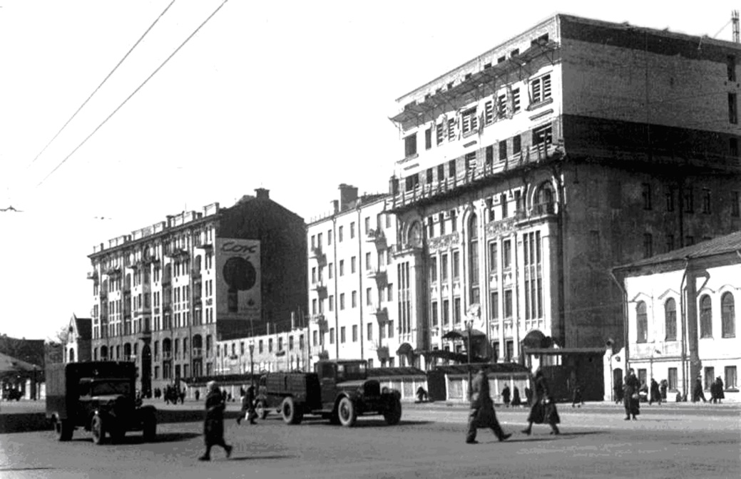 1940 г. Идёт реконструкция бывшего дома Чижиковой. На асфальте две едва заметные светлые полосы – возможно, это трамвайные рельсы. Слева от фотографа – Малая Бронная.