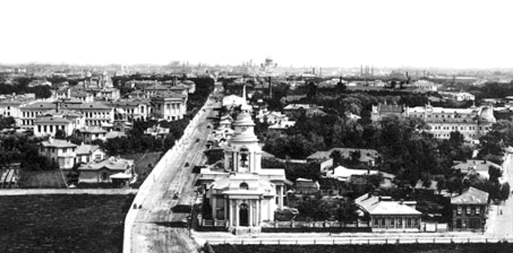 1900 г. Вид с Воробьёвых гор на Большую Пироговскую улицу. Слева – комплекс университетских клиник, а на переднем плане – Новодевичий монастырь. В 1940 году Булгаков был похоронен на кладбище этого монастыря.