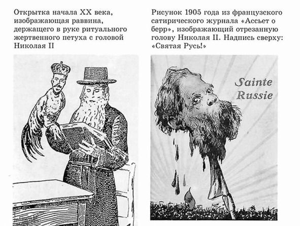 На первом рисунке: еврей-раввин готовит своего жертвенного петуха-Царя Российской Империи (и весь русский народ) к своему еврейскому жертвоприношению. Открытка начала 20 века. Незаконно распространялась в САСШ (США, где и начали распространять подобное бесчинство, там издавна находили себе прибежище международные преступники). Следом, открытка разошлась и по западным губерниям Российской Империи. Авторы и распространители, т.е. преступники, пока не установлены. Подозреваемые: евреи и англосаксы.