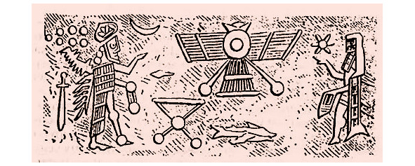 Изображение Земли и Марса с летящим космическим объектом на древнешумерской таблице. В прилагаемом тексте поясняется, что Земля обозначается семью точками, как седьмая планета с внешней стороны Солнечной системы. Рядом с ней мы видим изображение месяца. А Марс изображается шестигранной звездой, напоминающей по своему очертанию Звезду Давида.