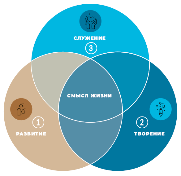 Первое. Я считаю, что смысл жизни и, соответственно, счастье человека заключаются в трех возможностях: 1) расти и развиваться, 2) творить собственную жизнь как главный шедевр по своему усмотрению и 3) служить другим людям через раскрытие своих уникальных талантов (рис. 1). Эти элементы взаимосвязаны, один без другого не существует. Невозможно создать жизнь своей мечты, не развиваясь; невозможно расти и развиваться, не реализуя в том или ином виде свою миссию служения миру и людям. Этимология слова «счастье» восходит к «со-частие», что означает «быть частью чего-то большего, чем ты». Для меня счастье – это глубоко заложенная в человеке потребность создавать нечто большее, чем он сам. Мы творческие создания и пришли в этот мир, чтобы, с одной стороны, познать опыт сотворения своей жизни в ее наилучшей возможной версии и, с другой стороны, позитивно влиять на жизнь окружающих. Поэтому для меня счастье – это процесс развития, творения и служения.