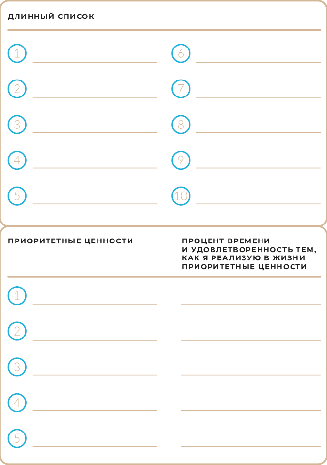 Недавно передо мной встал непростой выбор. Моему мужу из-за работы надо было переехать в другую страну, для него это было очень важно с точки зрения его самореализации. Я же свою самореализацию видела преимущественно в России и не хотела уезжать. Немного поразмыслив, я подумала, что для моего профессионального и личностного развития переезд тоже может быть очень полезным. Несколько недель я мучилась и вела сама с собой бесконечные внутренние диалоги о том, какое же решение мне принять. На свое счастье, я как раз редактировала эту книгу и дошла до блока «Ценности». Я прочитала список своих ценностей, и мои сомнения тут же развеялись: семья на данном этапе жизни для меня ценность номер один, и если нам лучше переехать и при этом я сохраняю возможность самореализации, значит, мы переезжаем.