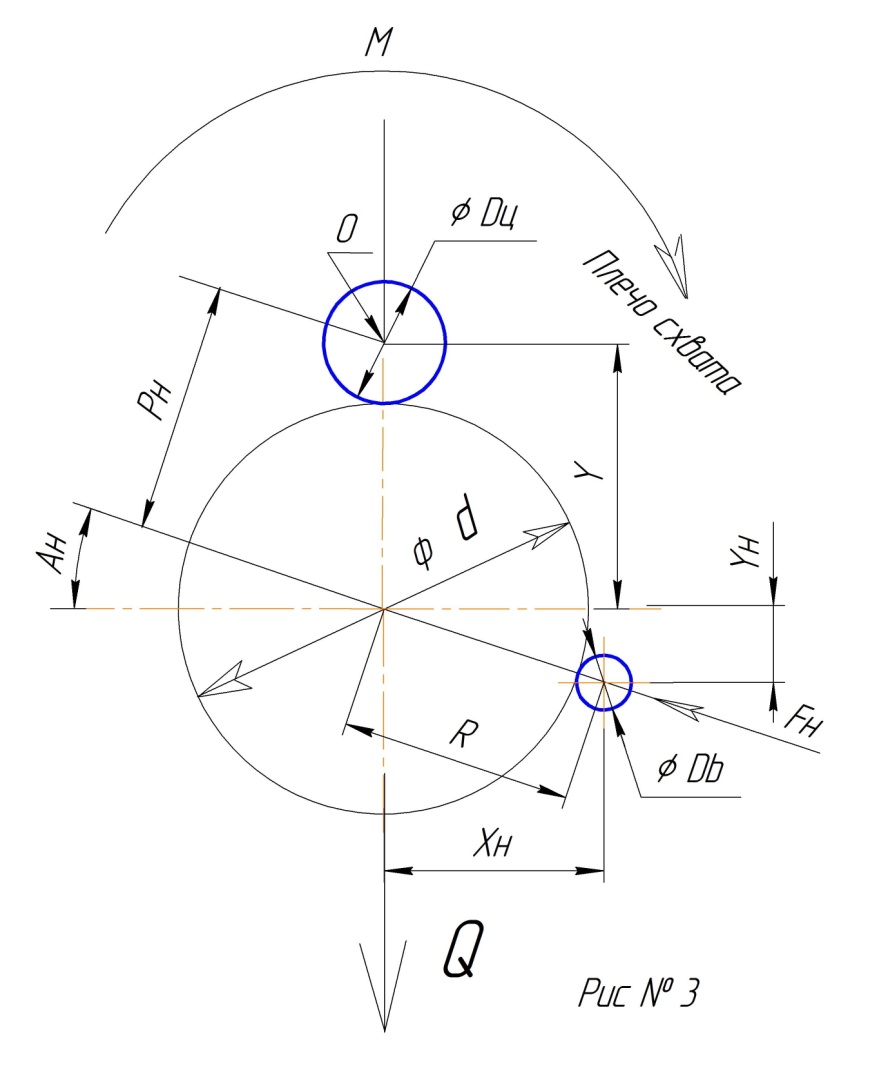 Центр круглой заготовки находится на вертикальной оси симметрии клещей. Линия приложения силы удержания заготовки проходит по осям центра бобышки и центра заготовки. Плечо момента силы удержания заготовки – кратчайшее расстояние от линии силы удержания до центра клещей. Эти данные позволяют математически точно вычислить положение заготовки Точное положение центра тяжести заготовки позволяет точно определить углы приложения сил, моменты и силы, действующие на детали клешней при захвате заготовки.