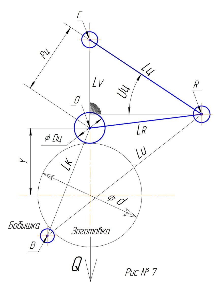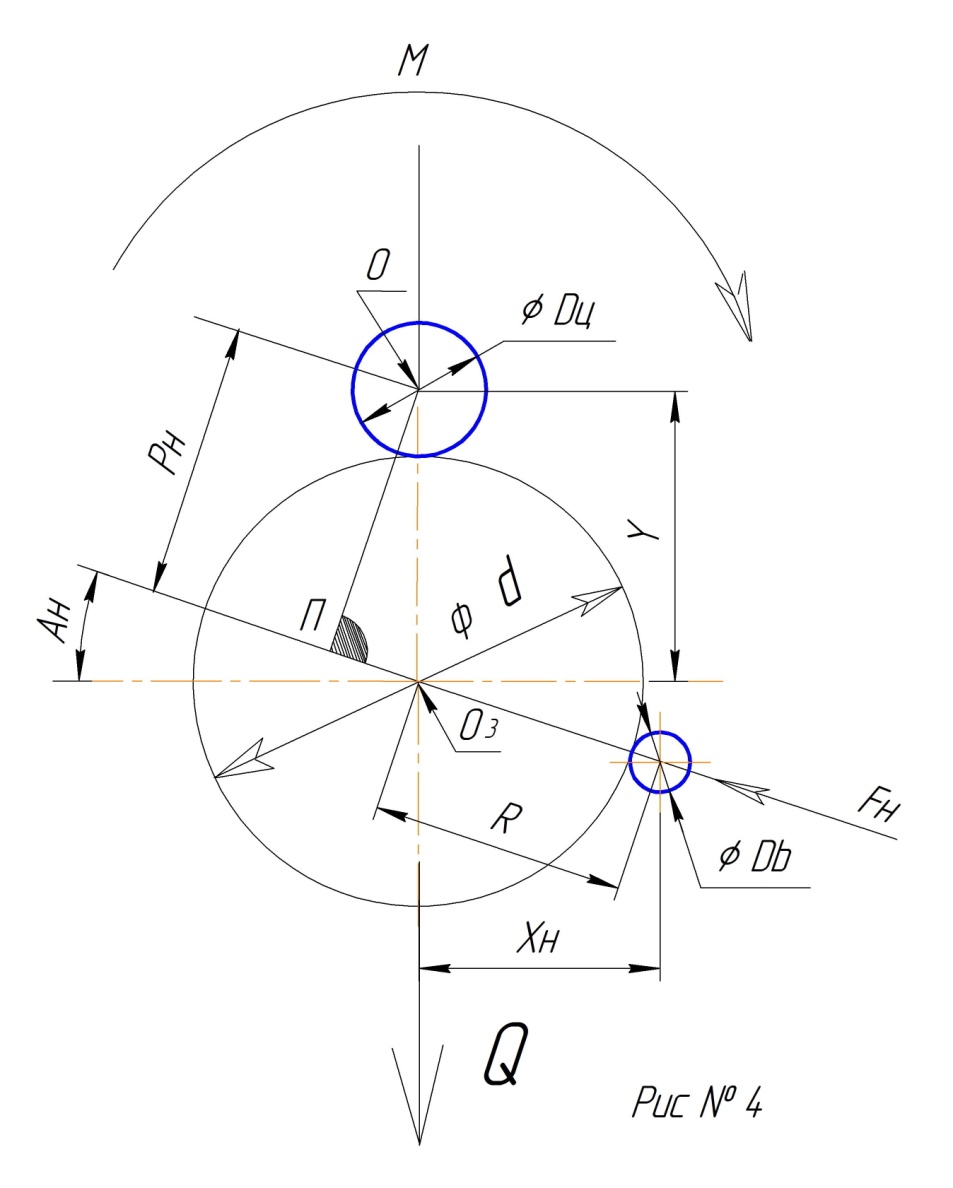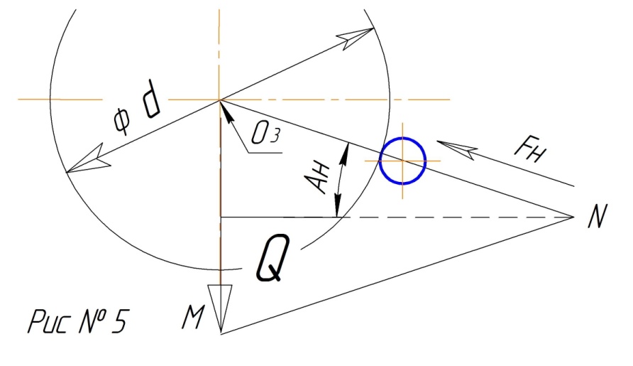 Как исходные данные: Диаметр заготовки d=140 мм. Положение бобышки ( смотри рис. 4 ) Хн = 20 мм. Угол давления по построению получается Ан=76,310 .. Строим линию силы Fн – силы удержания заготовки – проходящую через центр бобышки и через центр заготовки.