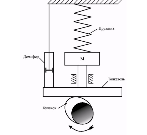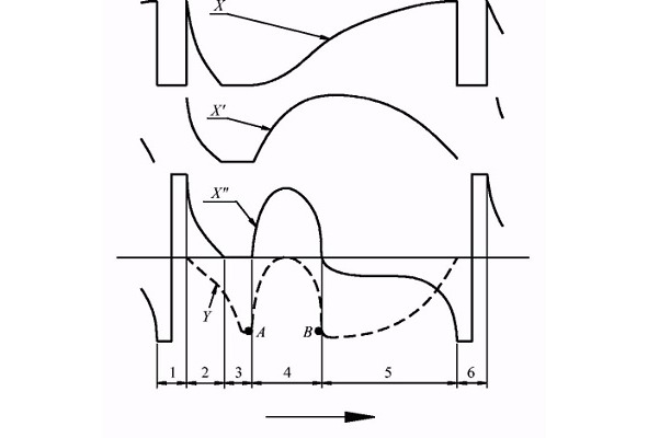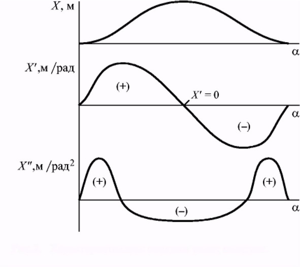 Посмотрим на природу «пассионарных толчков» Л. Н. Гумилева [4] с учетом представления о репрессивности культуры. Воспользуемся для этого вспомогательной схемой (рис.1), в которой возмущения в системе осуществляются кулачком. Для наглядности возмущения будем рассматривать в Метрической системе единиц. Характеристики закона движения толкателя получатся, естественно, по углу поворота кулачка α (рис.2). Перейти от угла поворота к времени не составит труда через угловую скорость кулачка ω. Величины Х, Х' , X'' – соответственно геометрические перемещение, скорость и ускорение толкателя с массой М. В других размерностях, как будет показано ниже, соответственно – работа (прирост материальной культуры), мощность (репрессивность культуры) и сила (либидо). Умножив значения X' и X'' соответственно на ω (рад/с) и ω2 (рад2/с2), получим новые размерности для Х' (м/с) и X'' (м/с2). Умножив размерности массы толкателя М (кг) и ускорения (м/с2), получим новую размерность X'' (кГ). Эта сила – источник работы. Сила, выполняющая работу (в контакте профиля кулачка и толкателя), при X'' > 0 – сумма, при X'' <0 – разность. Она равна сумме текущих сил пружины и демпфера, а также текущей силы X'' .