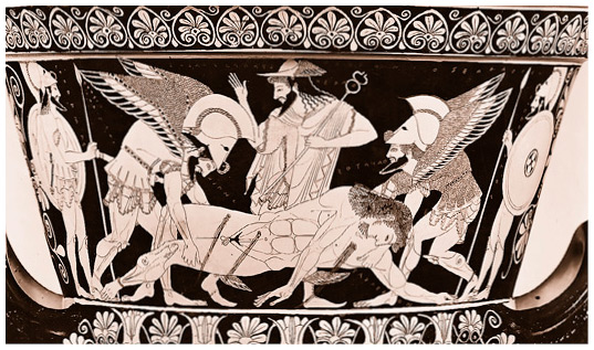 Крылатые Сон и Смерть уносят смертельно раненного героя (аттическая ваза, около 510 года до н. э.)