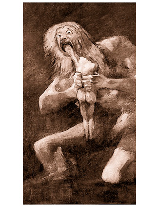 (Не)рождение олимпийцевКронос попытался отвратить возмездие со стороны своих детей за то, что сделал с собственным отцом, но убить их не мог, поскольку боги бессмертны. Опыт Урана подсказывал, что затолкать их обратно во чрево матери тоже не выход. Так что Кронос взял дело в свои руки (точнее, в свой желудок): он проглатывал детей по мере рождения (метафизическое отражение того факта, что в конце концов Время пожирает всех своих детей).