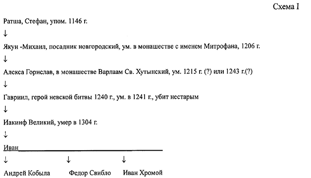 У Андрея Кобылы было пятеро сыновей – Семен Жеребец, Александр Елко, Василий Ивантей, Гаврила Гавша и Федор Кошка. (См. Приложение. Схема 1.)