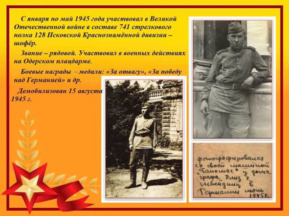 Так мой старший брат, Назаров Герман Степанович, 1926 года рождения, девятнадцатилетним, возмужавшим и закалённым в горниле Великой Отечественной Войны, пареньком встретил Победу в Праге, в составе своего 741-го, ордена Александра Невского стрелкового полка, 128-й Псковской Краснознамённой стрелковой дивизии, 118 корпуса.