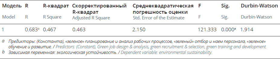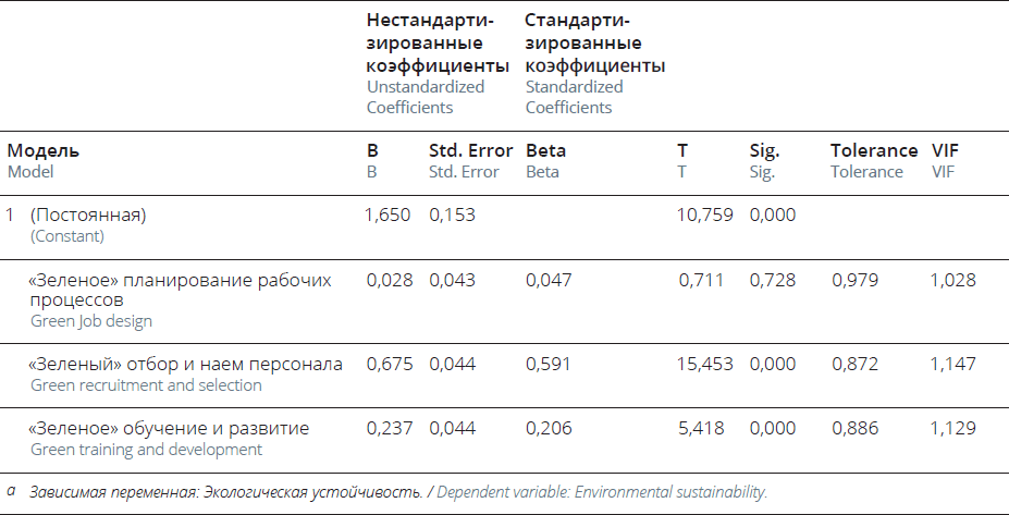 Где: ES = Экологическая устойчивость; β0 = параметр отсечения (константа); β1 = коэффициент «зеленого» планирования и анализа рабочих процессов; β2 = коэффициент «зеленого» отбора и найма персонала; β3 = коэффициент «зеленого» обучения и развития.