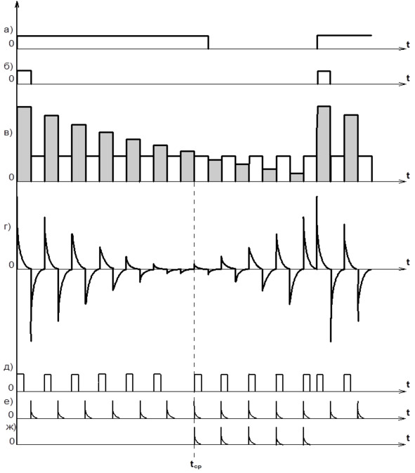 The generator of 2 rectangular pulses generates pulses with the required repetition rate. These pulses from the antiphase outputs go to the input of the frequency divider 3 and to the control inputs of the keys 7 and 8. Rectangular pulses from the output of the frequency divider 3 (Fig.2.a) go to the input of one vibrator 4.